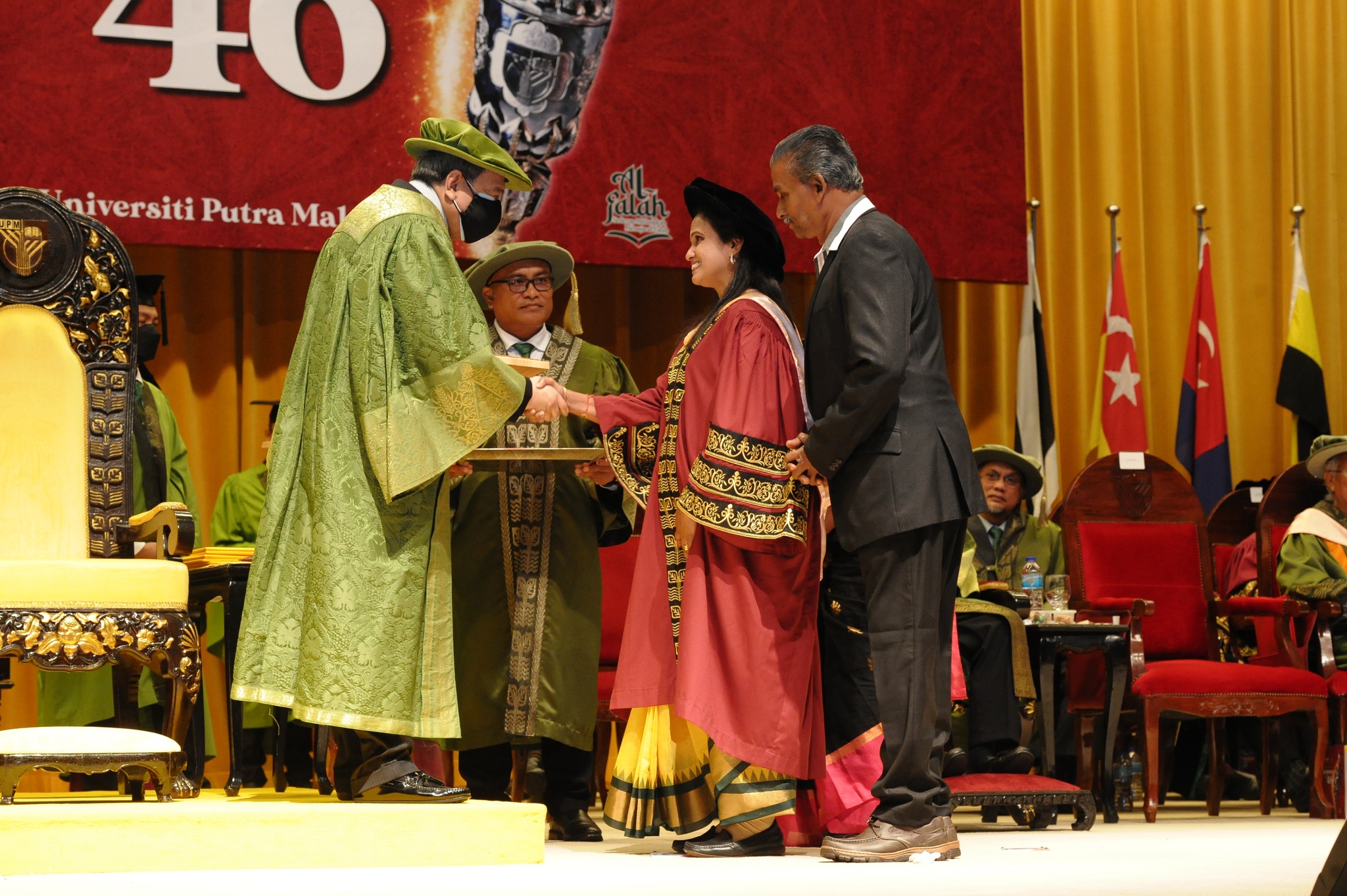 SERDANG, 26 Nov- Pensyarah Jabatan Kejuruteraan Mekanikal, Politenik Banting, Dr. Tamil Moli A/P Loganathan menerima anugerah Pingat Emas Doktor Falsafah (PhD) Malaysian Vaccines and Pharmaceuticals dalam Majlis Konvokesyen UPM ke-46 di sini, hari ini.